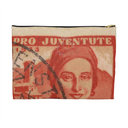 Frimärke ur Gösta Bodmans filatelistiska motivsamling, påbörjad 1950.Frimärke från Schweiz, 1933. Motiv av kvinnodräkt, Tessin. Large Organizer Pouch with Black Zipper