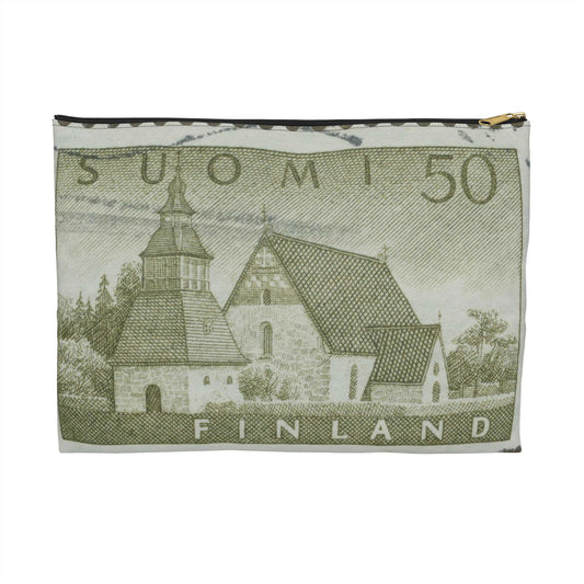 Frimärke ur Gösta Bodmans filatelistiska motivsamling, påbörjad 1950.Frimärke från Finland, 1957. Motiv av Lammi Kyrka med stigport och klockstapel. Large Organizer Pouch with Black Zipper