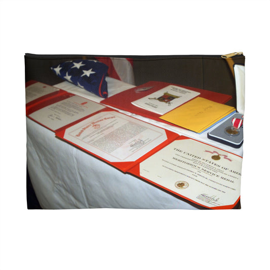A display of US Marine Corps (USMC) MASTER GUNNERY Sergeant (MGYSGT) Stephen W. Shields' awards lay on a table during his retirement ceremony, at the Clubs of Quantico, Marine Corps Base (MCB) Quantico, Virginia Large Organizer Pouch with Black Zipper