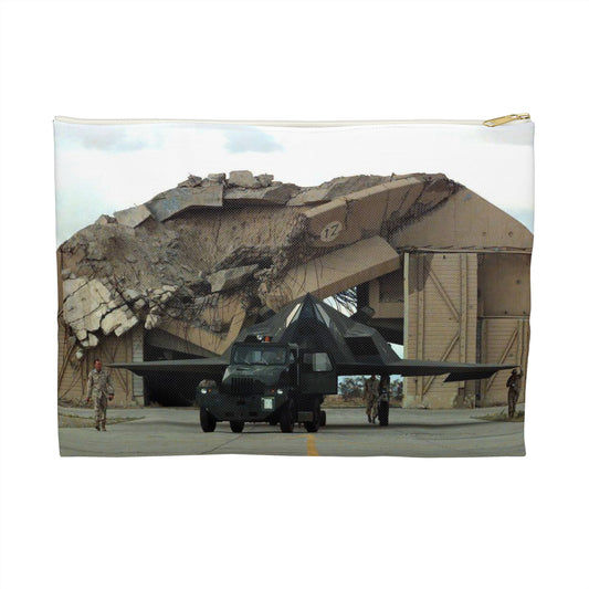 F-117A is towed in front of a destroyed aircraft shelter, Ahmed Al-Jaber Air Base, Kuwait, March 8, 1998 Large Organizer Pouch with Black Zipper