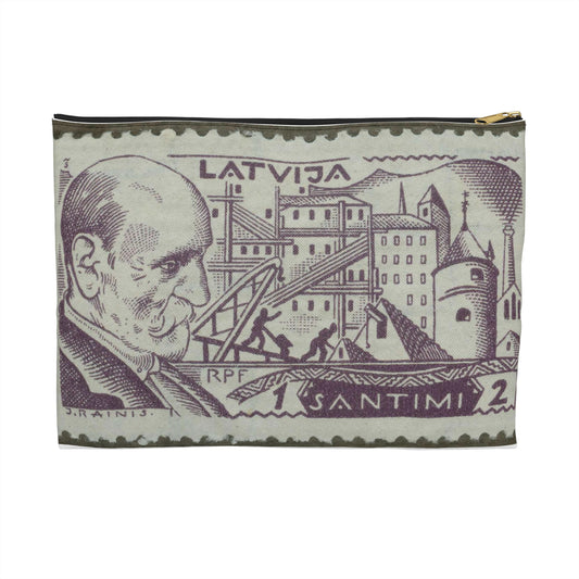 Frimärke ur Gösta Bodmans filatelistiska motivsamling, påbörjad 1950.Frimärke från Lettland, 1930. Motiv av byggnadsarbetare för ett monument över författare Rainis. Large Organizer Pouch with Black Zipper