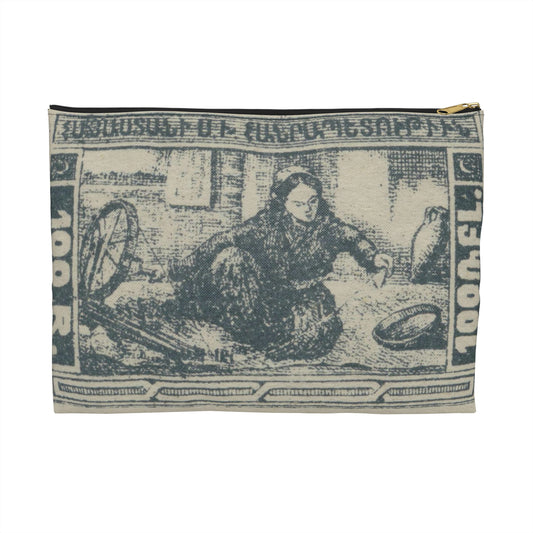 Frimärke ur Gösta Bodmans filatelistiska motivsamling, påbörjad 1950.Frimärke från Armenien, 1922. Motiv av textilarbetare. Kvinna med gammaldags spinnrock. Large Organizer Pouch with Black Zipper