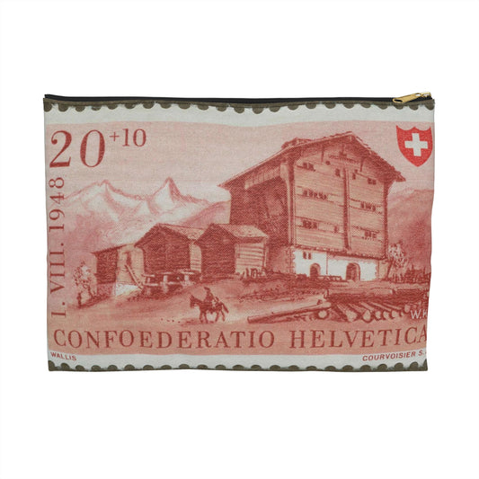 Frimärke ur Gösta Bodmans filatelistiska motivsamling, påbörjad 1950.Frimärke från Schweiz, 1948. Motiv av typisk byggnad i Wallis, 1948-08-01. Large Organizer Pouch with Black Zipper