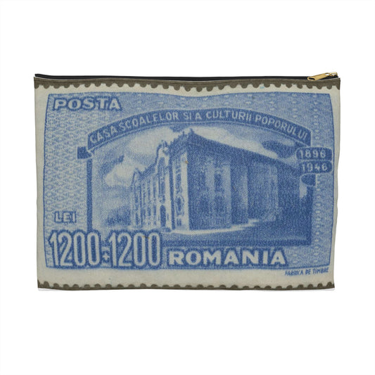 Frimärke ur Gösta Bodmans filatelistiska motivsamling, påbörjad 1950.Frimärke från Rumänien, 1947. Motiv av skola för social undervisning. "Propaganda för folkupplysning". Large Organizer Pouch with Black Zipper
