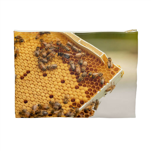Honey bees transfer pollen to a honeycomb cell. Bee Large Organizer Pouch with Black Zipper