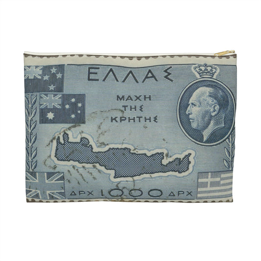 Frimärke ur Gösta Bodmans filatelistiska motivsamling, påbörjad 1950.Frimärke från Grekland, 1950. Motiv av karta över Kreta. "9-årsminne av slaget vid Kreta 1941". Large Organizer Pouch with Black Zipper