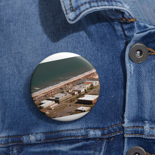 An aerial view of the Naval Surface Warfare Center testing building on the Dam Neck Naval Base. Along the beach are various types of gun mounts with their associated fire control radars atop the test building Pin Buttons with Crisp Design