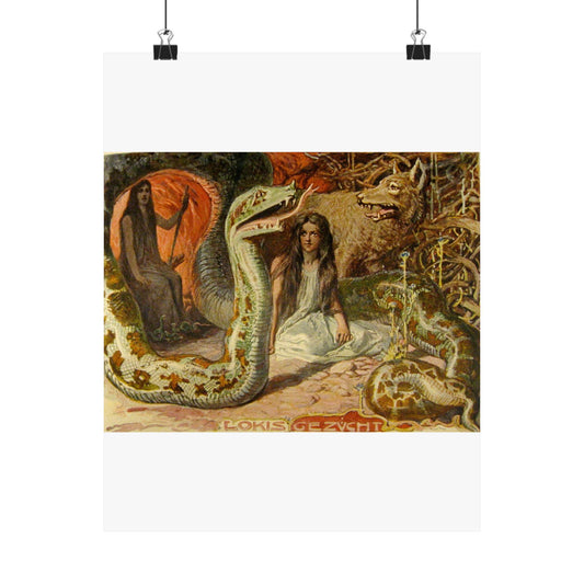 Lokis Gezücht - A painting of a woman sitting in front of a snake High Quality Matte Wall Art Poster for Home, Office, Classroom