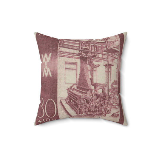 Frimärke ur Gösta Bodmans filatelistiska motivsamling, påbörjad 1950.Frimärke från Österrike, 1947. Motiv av jacquardvävstol i Österrike 1947. "Wienermässan 1947" Decorative Accent Square Pillow