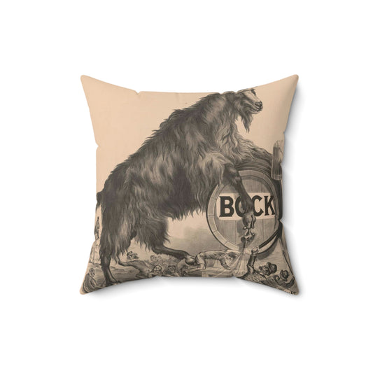 Giant bock goat resting on a keg, holding a mug of beer, men under the goat scrambling Decorative Accent Square Pillow