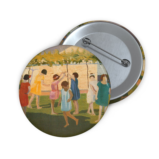 Petrona Viera - A painting of a group of children playing with a kite Pin Buttons with Crisp Design
