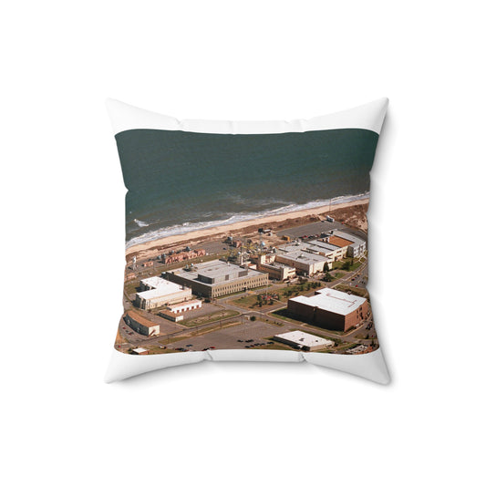 An aerial view of the Naval Surface Warfare Center testing building on the Dam Neck Naval Base. Along the beach are various types of gun mounts with their associated fire control radars atop the test building Decorative Accent Square Pillow