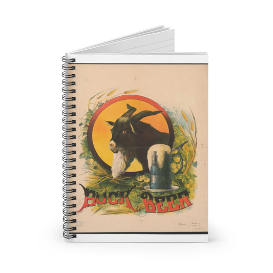 Bock Beer, the head of a goat inside an oval, with a stein of beer sitting on a bed of hops, underneath the oval Spiral Bound Ruled Notebook with Printed Cover