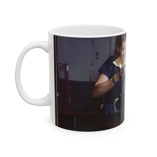 A young woman employee of North American Aviation, Incorporated, working over the landing gear mechanism of a P-51 fighter plane, Inglewood, Calif. The mechanism resembles a small cannon Beautiful Novelty Ceramic Coffee Mug 11oz