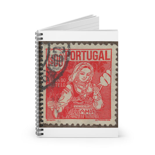 Frimärke ur Gösta Bodmans filatelistiska motivsamling, påbörjad 1950.Frimärke frånPortugal, 1941. Motiv av garnspinnande med slända. "Kvinna från Viana do Castelo". Spiral Bound Ruled Notebook with Printed Cover