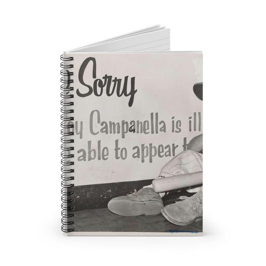 "We're sorry, but Roy Campanella is ill a[nd ...] not be able to appear [...] / World Telegram & Sun photo by Roger Higgins. Spiral Bound Ruled Notebook with Printed Cover