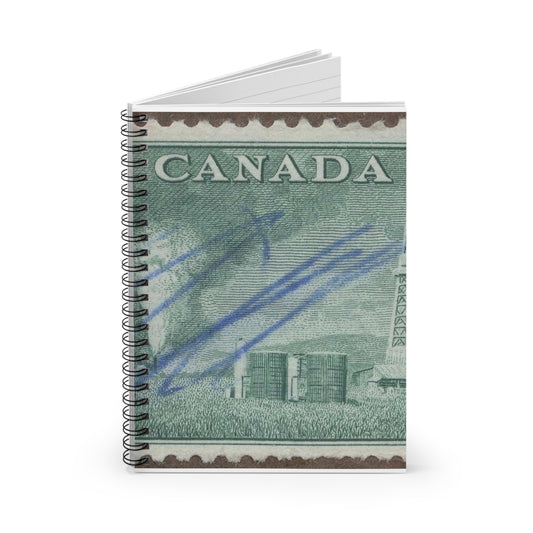 Frimärke ur Gösta Bodmans filatelistiska motivsamling, påbörjad 1950.Frimärke från Canada, 1950. Motiv av petroleumutvinning i Alberta. Spiral Bound Ruled Notebook with Printed Cover