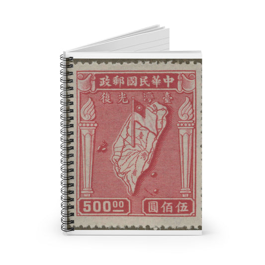 Frimärke ur Gösta Bodmans filatelistiska motivsamling, påbörjad 1950.Frimärke från Formosa, 1958. Motiv av karta över Formosa. Spiral Bound Ruled Notebook with Printed Cover