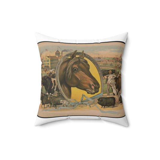 Horse framed by a horseshoe with fair buildings and a racetrack in the background Decorative Accent Square Pillow