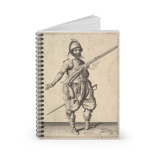 A soldier on guard freeing his right hand, from the Marksmen series, plate 37, in Wapenhandelinghe van Roers Musquetten Ende Spiessen (The Exercise of Arms) Spiral Bound Ruled Notebook with Printed Cover