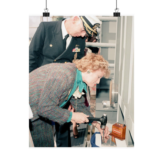 Mrs. E. Meese and Captain (CAPT) R.H. Randall, supervisor of Shipbuilding, Conversion, and Repair, participate in the keel laying of the guided missile frigate Rodney M. Davis (FFG 60) High Quality Matte Wall Art Poster for Home, Office, Classroom
