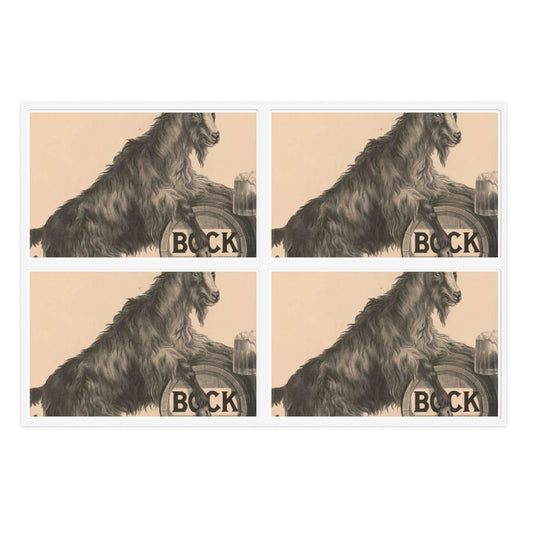 Giant bock goat resting on a keg, holding a mug of beer, men under the goat scrambling Laminated UV Protective Vinyl Stickers