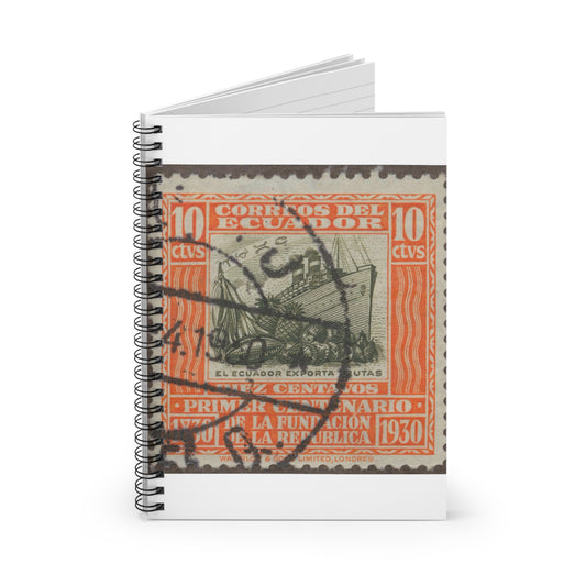 Frimärke ur Gösta Bodmans filatelistiska motivsamling, påbörjad 1950.Frimärke från Ecuador, 1930. Motiv av fartyg med förstorade exportfrukter. "100-årsminne: Republikens grundande". Spiral Bound Ruled Notebook with Printed Cover