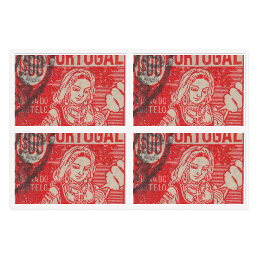 Frimärke ur Gösta Bodmans filatelistiska motivsamling, påbörjad 1950.Frimärke frånPortugal, 1941. Motiv av garnspinnande med slända. "Kvinna från Viana do Castelo". Laminated UV Protective Vinyl Stickers