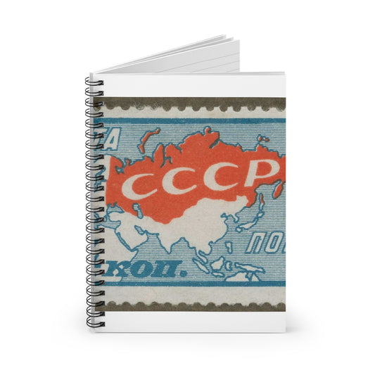 Frimärke ur Gösta Bodmans filatelistiska motivsamling, påbörjad 1950.Frimärke från Ryssland 1927. Motiv av karta över Sovjetuionen, Europa och Asien. "10 årsminne om Oktoberrevulutionen 1917". Spiral Bound Ruled Notebook with Printed Cover