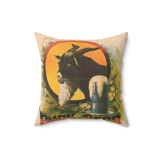 Bock Beer, the head of a goat inside an oval, with a stein of beer sitting on a bed of hops, underneath the oval Decorative Accent Square Pillow