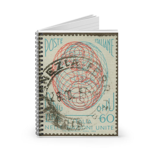 Frimärke ur Gösta Bodmans filatelistiska motivsamling, påbörjad 1950.Frimärke från Italien, 1956. Motiv av ellipsoidisk jordlob. "Italien ingår i F. N.". Spiral Bound Ruled Notebook with Printed Cover