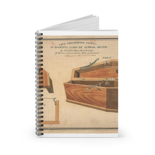 Patent drawing - Drawing for a Life - Preserving Coffin Public domain image Spiral Bound Ruled Notebook with Printed Cover