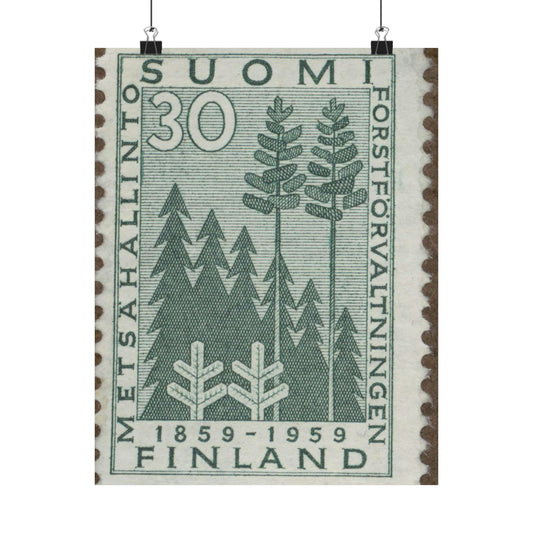 Frimärke ur Gösta Bodmans filatelistiska motivsamling, påbörjad 1950.Frimärke från Finland, 1959. Motiv av stiliserad gran och tall. "Forstförvaltningen 100 år: 1859-1959". High Quality Matte Wall Art Poster for Home, Office, Classroom