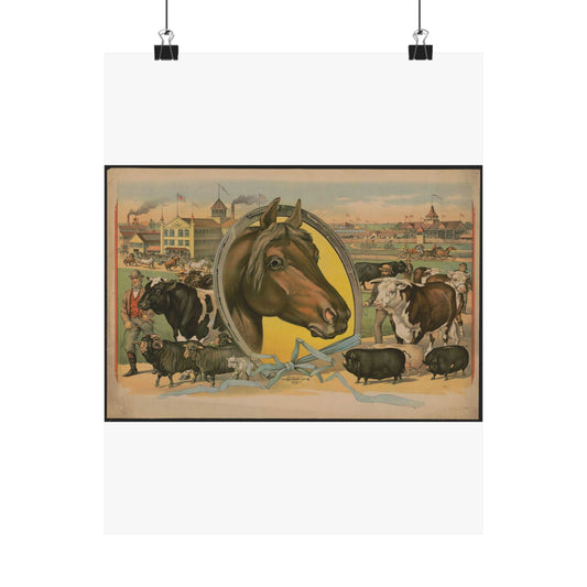 Horse framed by a horseshoe with fair buildings and a racetrack in the background High Quality Matte Wall Art Poster for Home, Office, Classroom