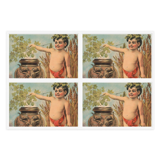 Bock beer boy standing to the right of a vat, which is inscribed hops malt, holding hops over the vat Laminated UV Protective Vinyl Stickers