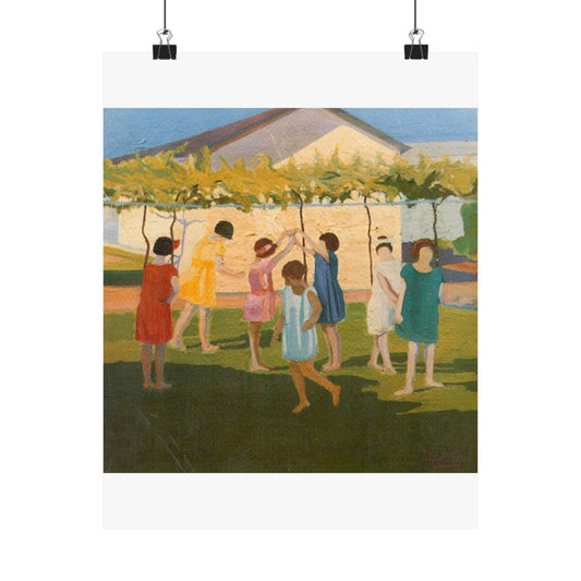 Petrona Viera - A painting of a group of children playing with a kite High Quality Matte Wall Art Poster for Home, Office, Classroom