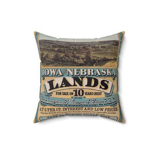 Millions of acres. Iowa and Nebraska. Land for sale on 10 years credit by the Burlington & Missouri River R. R. Co. at 6 per ct interest and low prices ... Buffalo. N. Y. Commercial advertiser printing house [1872]. Decorative Accent Square Pillow