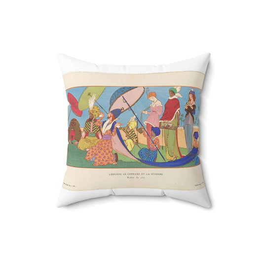 Gazette du Bon Ton, 1914 - No. 1, Pl. I: L'Encens, Le Cinname et la Myrrhe / Robes du soir. Decorative Accent Square Pillow
