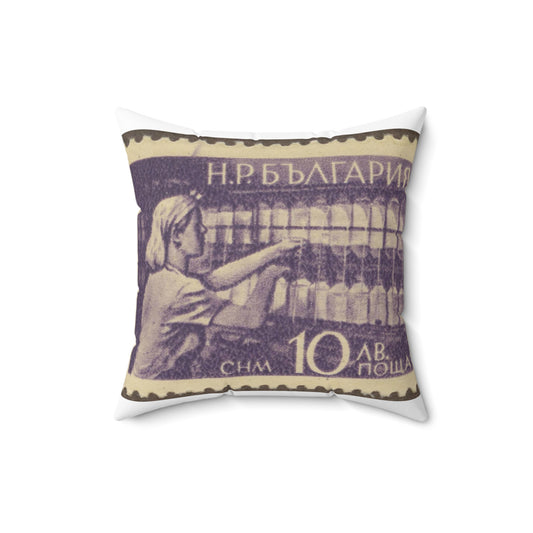 Frimärke ur Gösta Bodmans filatelistiska motivsamling, påbörjad 1950.Frimärke från Bulgarien, 1949. Motiv av textilarbetare vid spinnmaskin. "Serie: Honör för unga yrkesarbetare". Decorative Accent Square Pillow