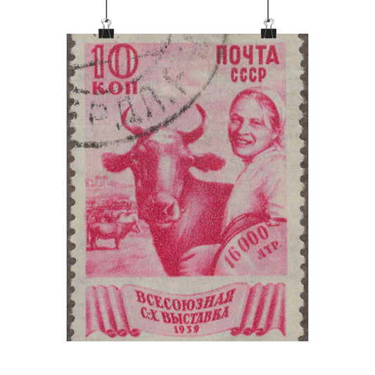 Frimärke ur Gösta Bodmans filatelistiska motivsamling, påbörjad 1950.Frimärke från Ryssland, 1939. Motiv av ko och mjölkerska. "Lantbruksutatällning i Sovjetunionen". High Quality Matte Wall Art Poster for Home, Office, Classroom