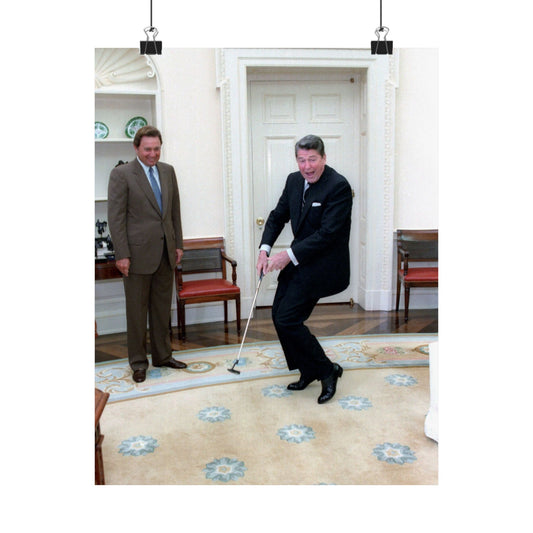 President Ronald Reagan Putting a Golf Ball with Raymond Floyd Looking on in the Oval Office High Quality Matte Wall Art Poster for Home, Office, Classroom