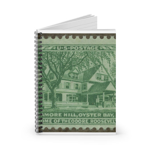 Frimärke ur Gösta Bodmans filatelistiska motivsamling, påbörjad 1950.Frimärke från USA, 1956. Motiv av Sagamore HIll i Oyster Bay, N.Y. President Theodor Roosevelts hem (1859-1919). Spiral Bound Ruled Notebook with Printed Cover