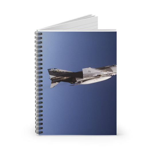 An air-to-air right side view of a 497th Tactical Fighter Squadron F-4E Phantom II aircraft in a vertical climb during Exercise TEAM SPIRIT'86. The aircraft is armed with an AIM-9 Sidewinder missile Spiral Bound Ruled Notebook with Printed Cover