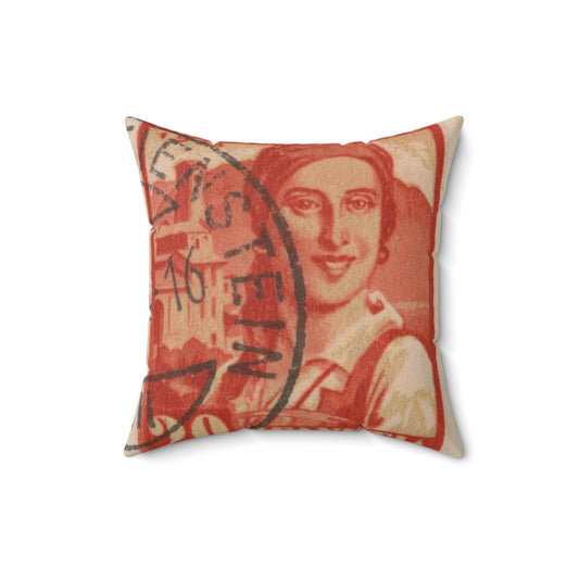 Frimärke ur Gösta Bodmans filatelistiska motivsamling, påbörjad 1950.Frimärke från Schweiz, 1933. Motiv av kvinnodräkt, Tessin. Decorative Accent Square Pillow