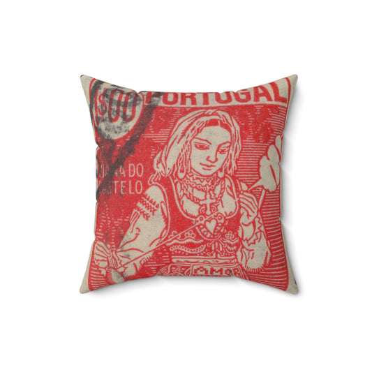 Frimärke ur Gösta Bodmans filatelistiska motivsamling, påbörjad 1950.Frimärke frånPortugal, 1941. Motiv av garnspinnande med slända. "Kvinna från Viana do Castelo". Decorative Accent Square Pillow