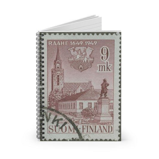 Frimärke ur Gösta Bodmans filatelistiska motivsamling, påbörjad 1950.Frimärke från Finland, 1949. Motiv av Brahestads Kyrka. "Brahestad 300 år: 1649-1949". Spiral Bound Ruled Notebook with Printed Cover