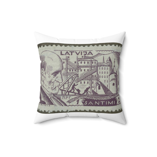 Frimärke ur Gösta Bodmans filatelistiska motivsamling, påbörjad 1950.Frimärke från Lettland, 1930. Motiv av byggnadsarbetare för ett monument över författare Rainis. Decorative Accent Square Pillow