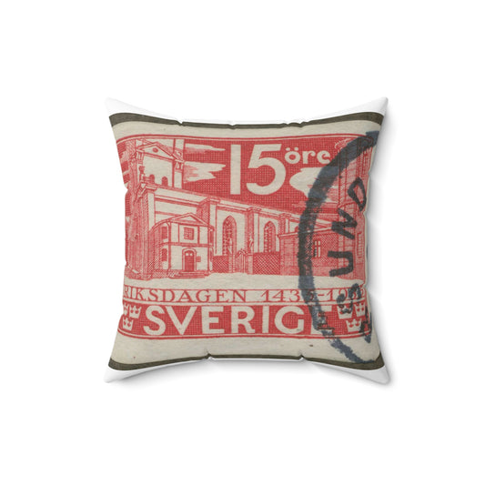 Frimärke ur Gösta Bodmans filatelistiska motivsamling, påbörjad 1950.Frimärke från Sverige. Motiv av Storkyrkan i Stockholm. "Den svenska riksdagen 500 år 1435-1935". Decorative Accent Square Pillow
