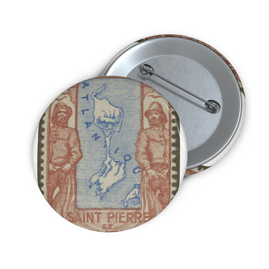 Frimärke ur Gösta Bodmans filatelistiska motivsamling, påbörjad 1950.Frimärke från Saint Pierre et Miquelon 1932. Motiv av karta över Saint Pierre et Miquelon. Fiskare med nät. Pin Buttons with Crisp Design