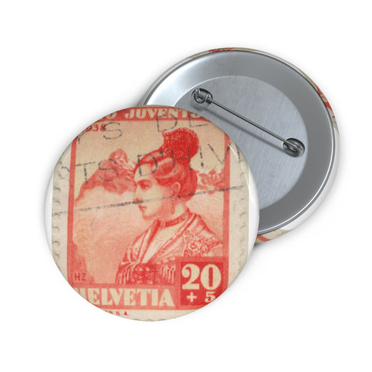 Frimärke ur Gösta Bodmans filatelistiska motivsamling, påbörjad 1950.Frimärke från Schweiz, 1938. Motiv av kvinnodräkt, Uri. Pin Buttons with Crisp Design